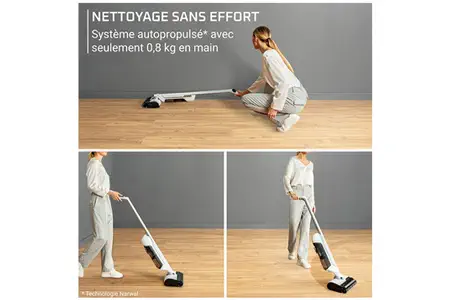 Sa technologie de rouleau autopropulsé Narwal offre un nettoyage sans effort avec un poids de seulement 0,8 kg en main, associé à un design plat à 180°, parfait pour passer sous les meubles.